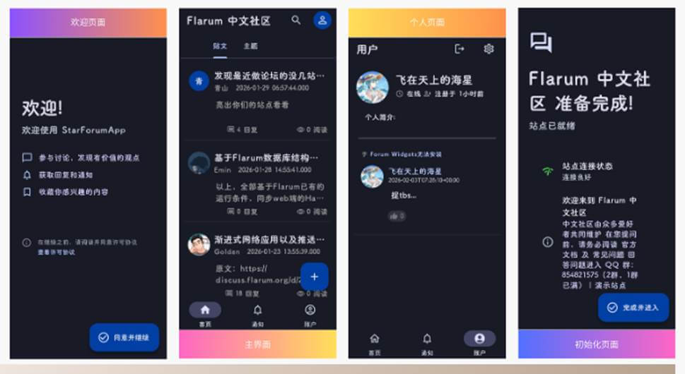 StarForum 最初只是一次帮朋友解决问题的尝试。朋友基于 Flarum 搭建了论坛,希望有一个属于自己站点的客户端。最开始试过把网页直接封装成 H5 App,但在服务器部署海外、缺乏针对性优化的情况下,加载和交互体验始终不够理想,于是才有了这个项目。
